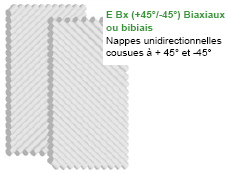 Les bi-axiaux (bibiais) qui sont composés de 2 nappes avec des angles -45/+45°. Ils sont essentiellement utilisés pour faire des jonctions, passer des angles importants ou sur des pièces dont les efforts sont assez diffus.